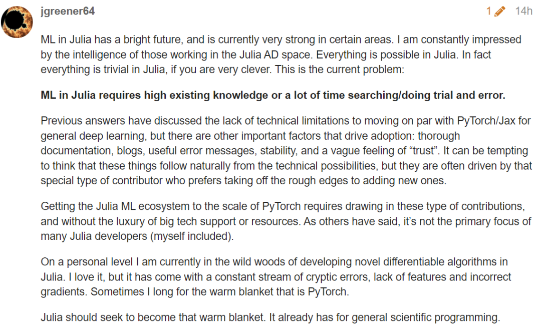 网友 @jgreener64 表示:「Julia 中的 ML 在某些领域应用非常强大,Julia 一切皆有可能。Julia 面临的问题是:Julia 中的 ML 需要大量现有知识或大量时间搜索 / 反复试验。在个人层面上,我目前正在用 Julia 开发新颖的可微分算法。」