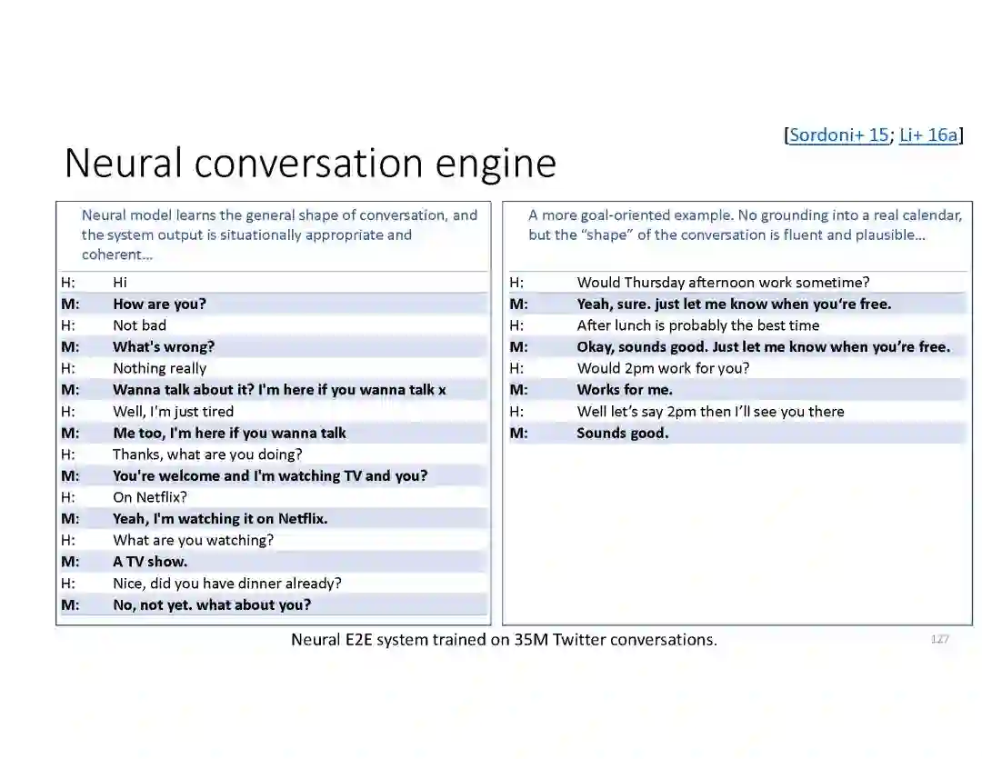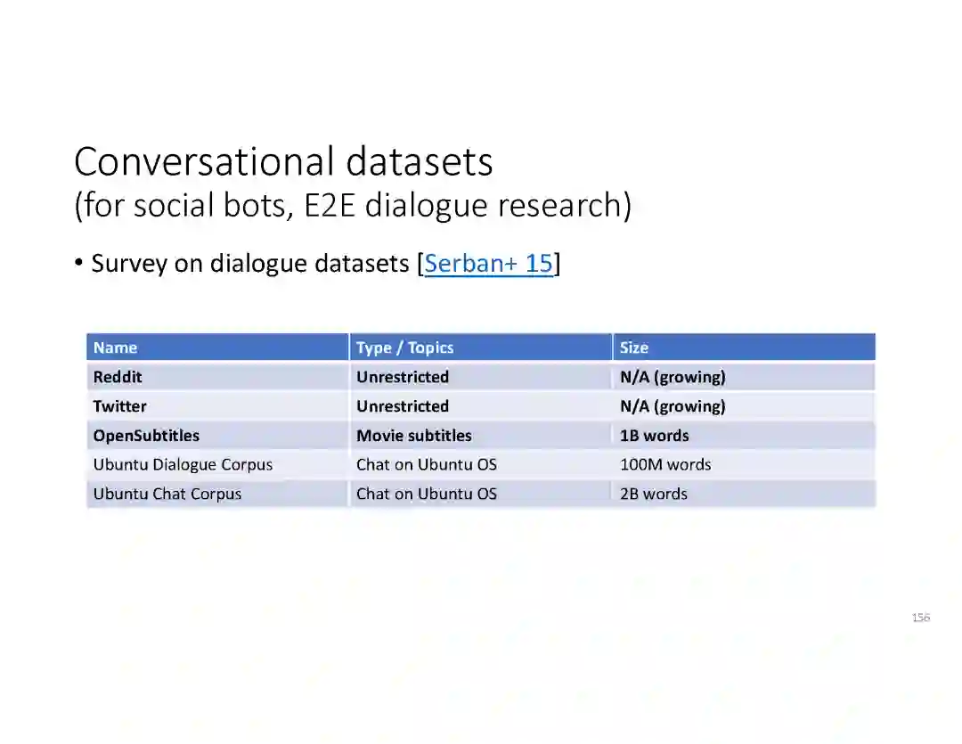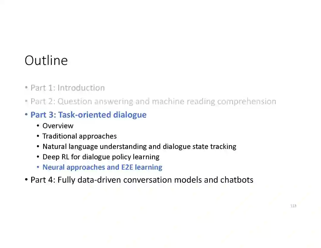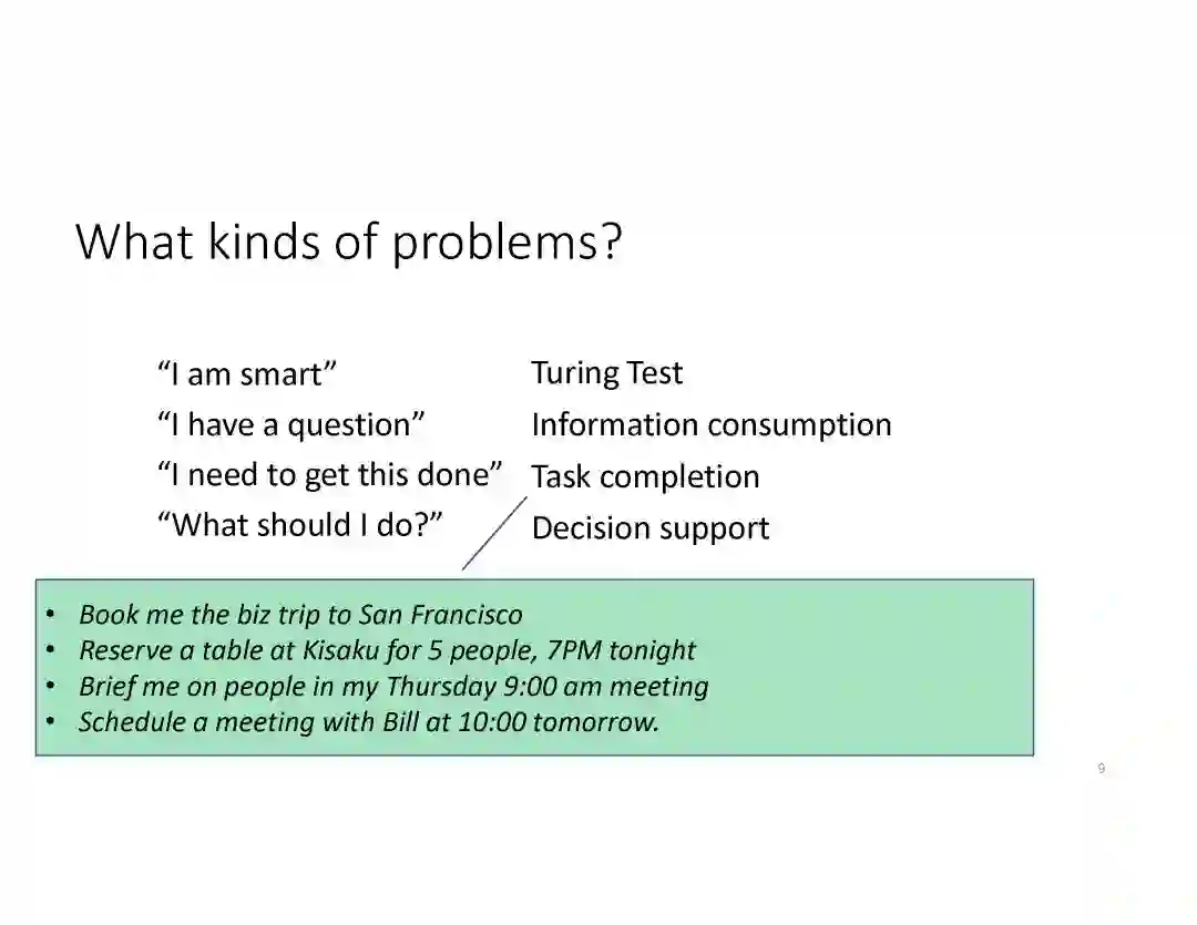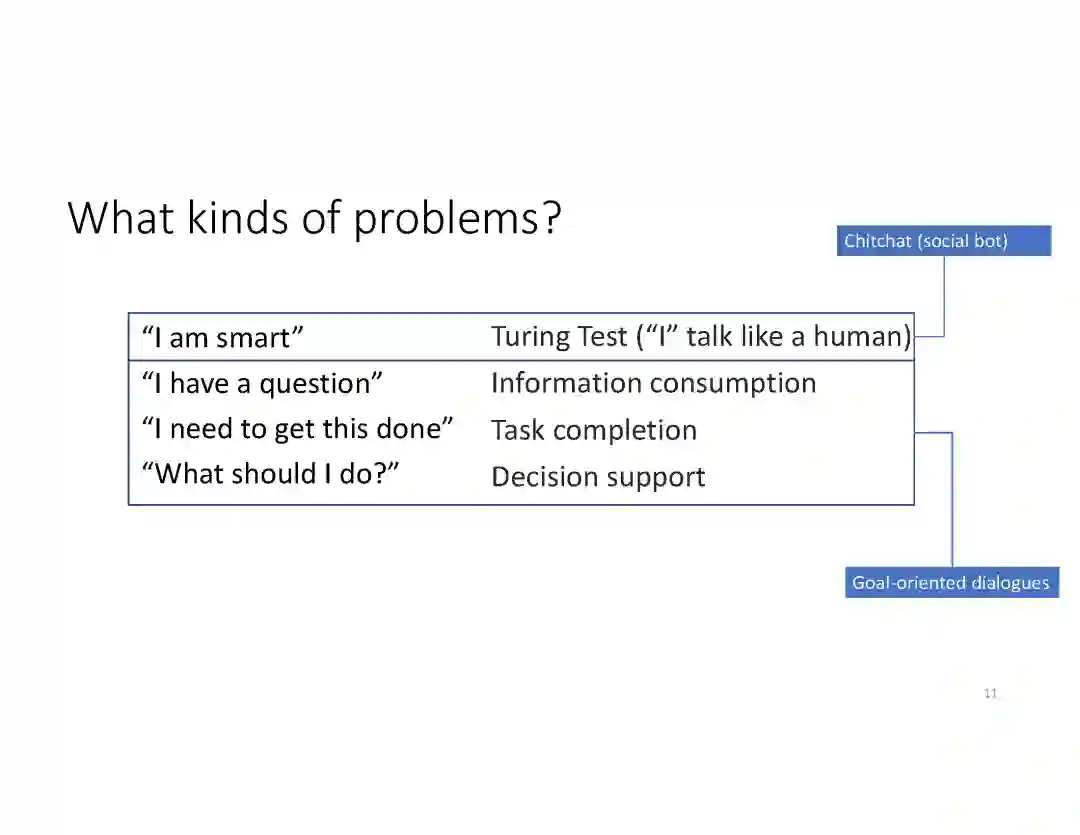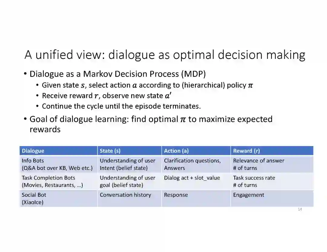在这个PPT中,他们首先介绍与自然语言处理和对话人工智能相关的深度学习和增强学习的最新进展。然后,详细地描述了为实现三种对话系统而开发的最先进的神经网络方法。