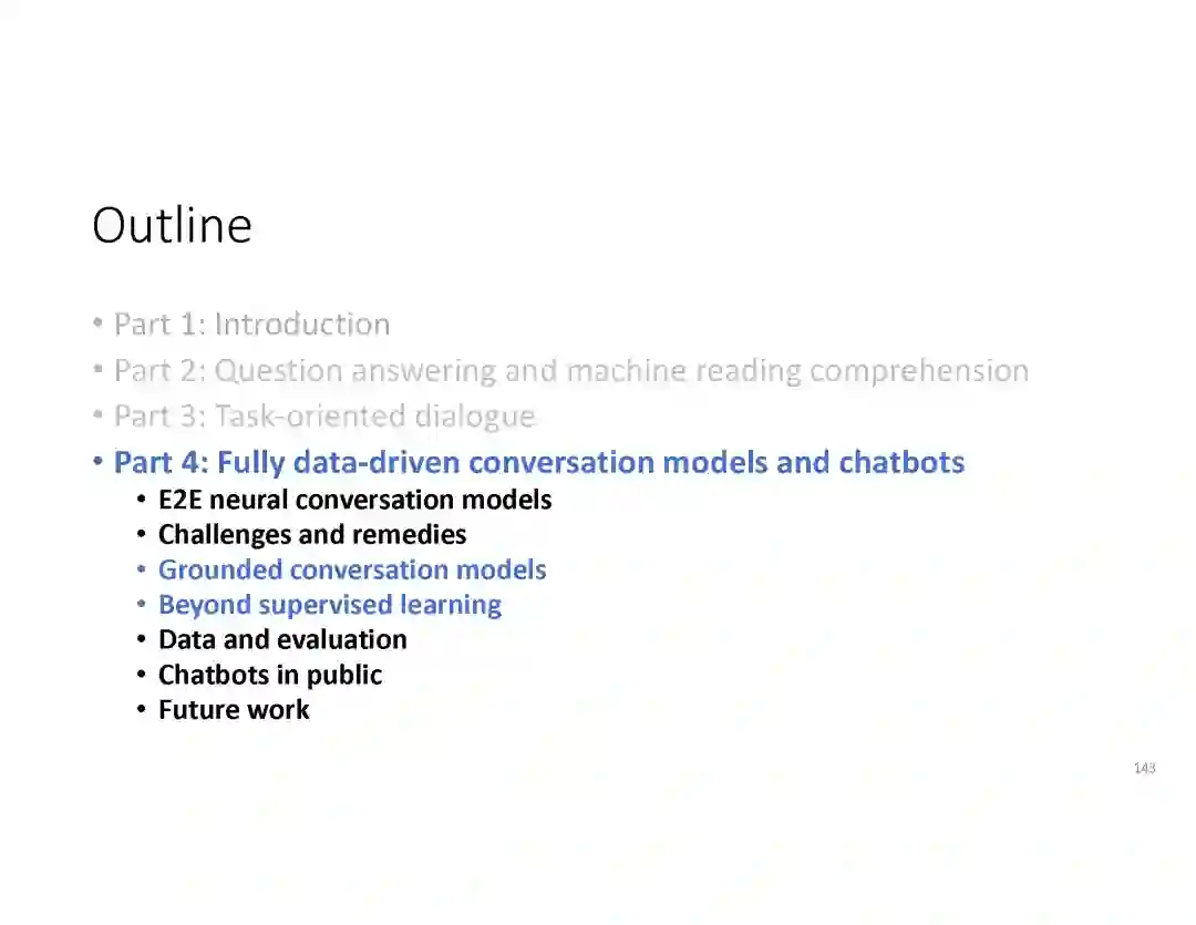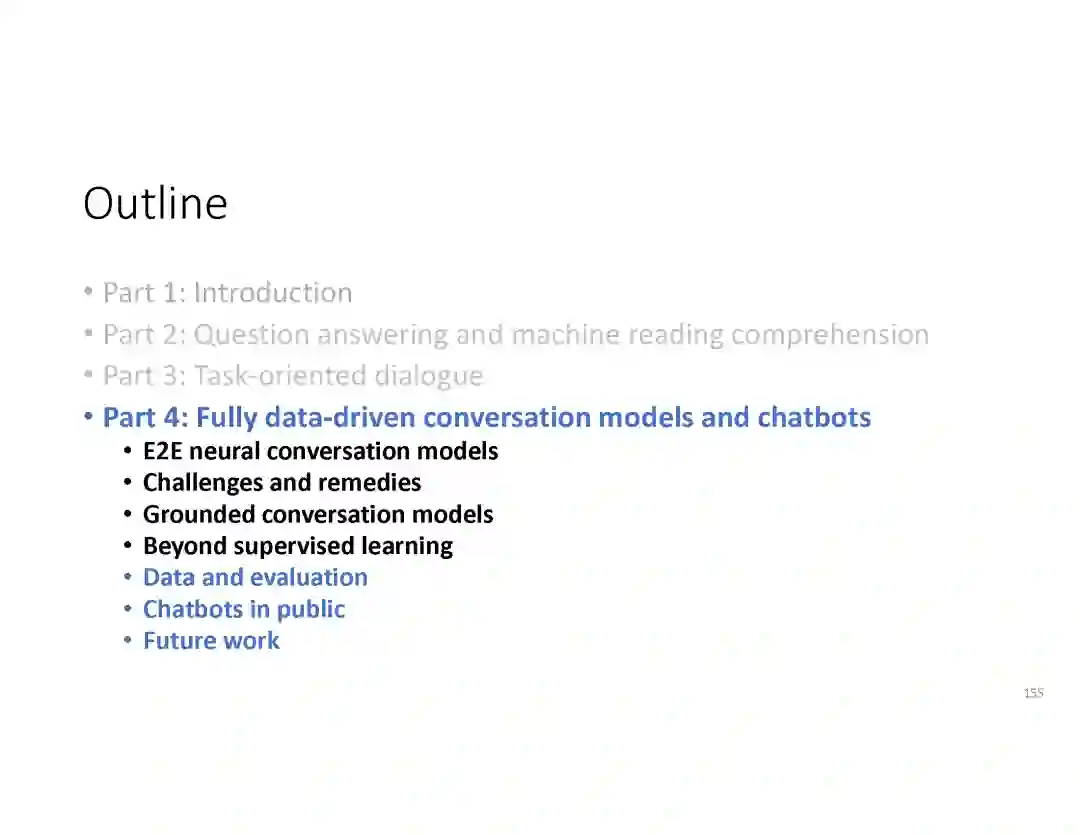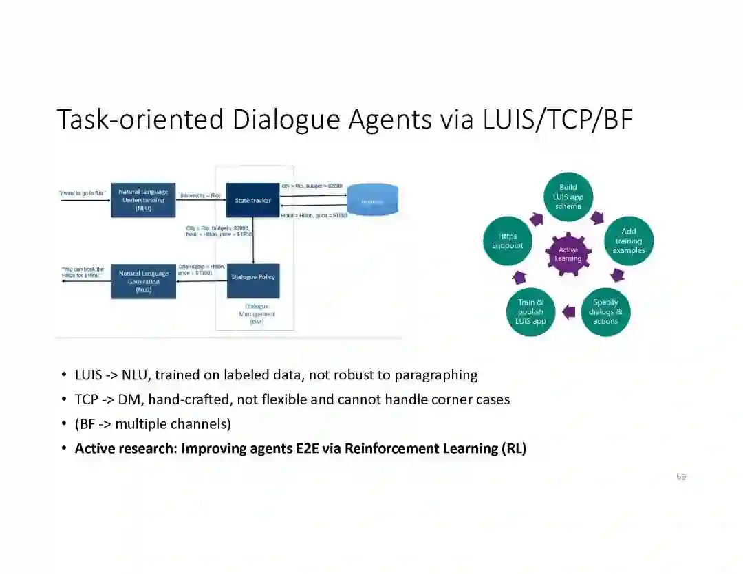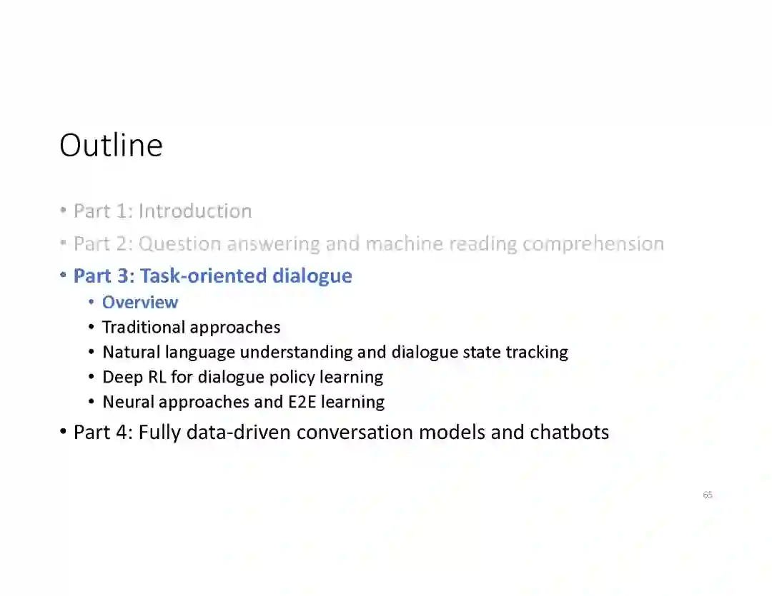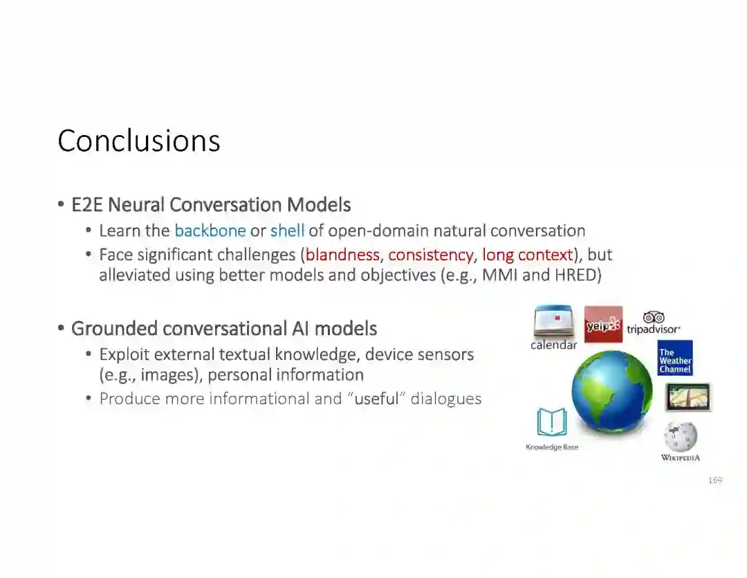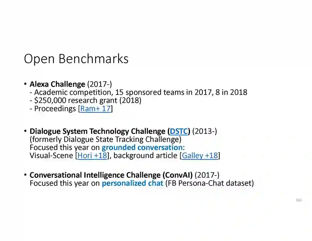 在这个PPT中,他们首先介绍与自然语言处理和对话人工智能相关的深度学习和增强学习的最新进展。然后,详细地描述了为实现三种对话系统而开发的最先进的神经网络方法。