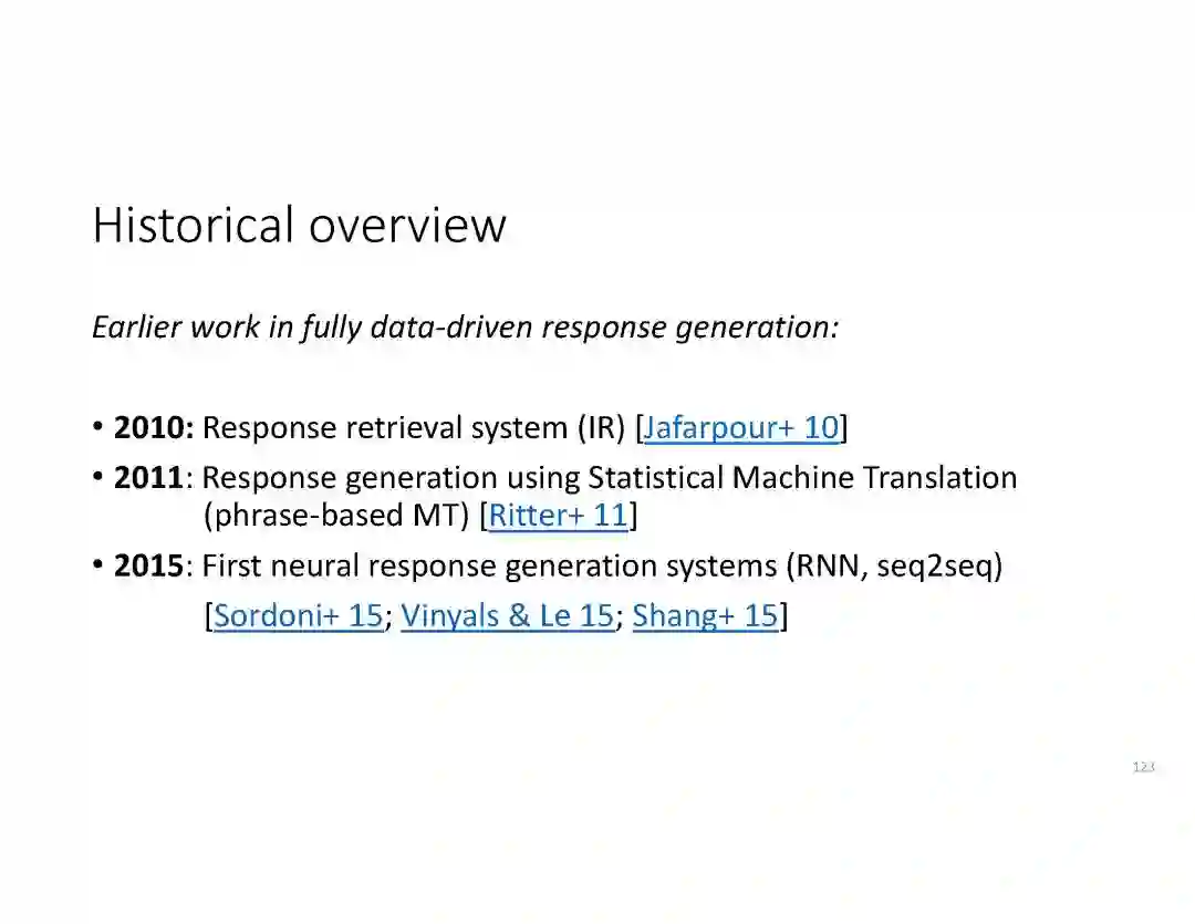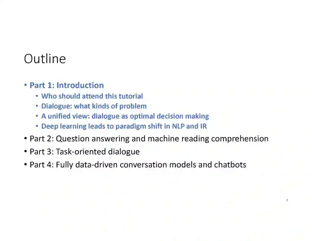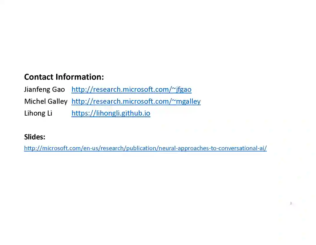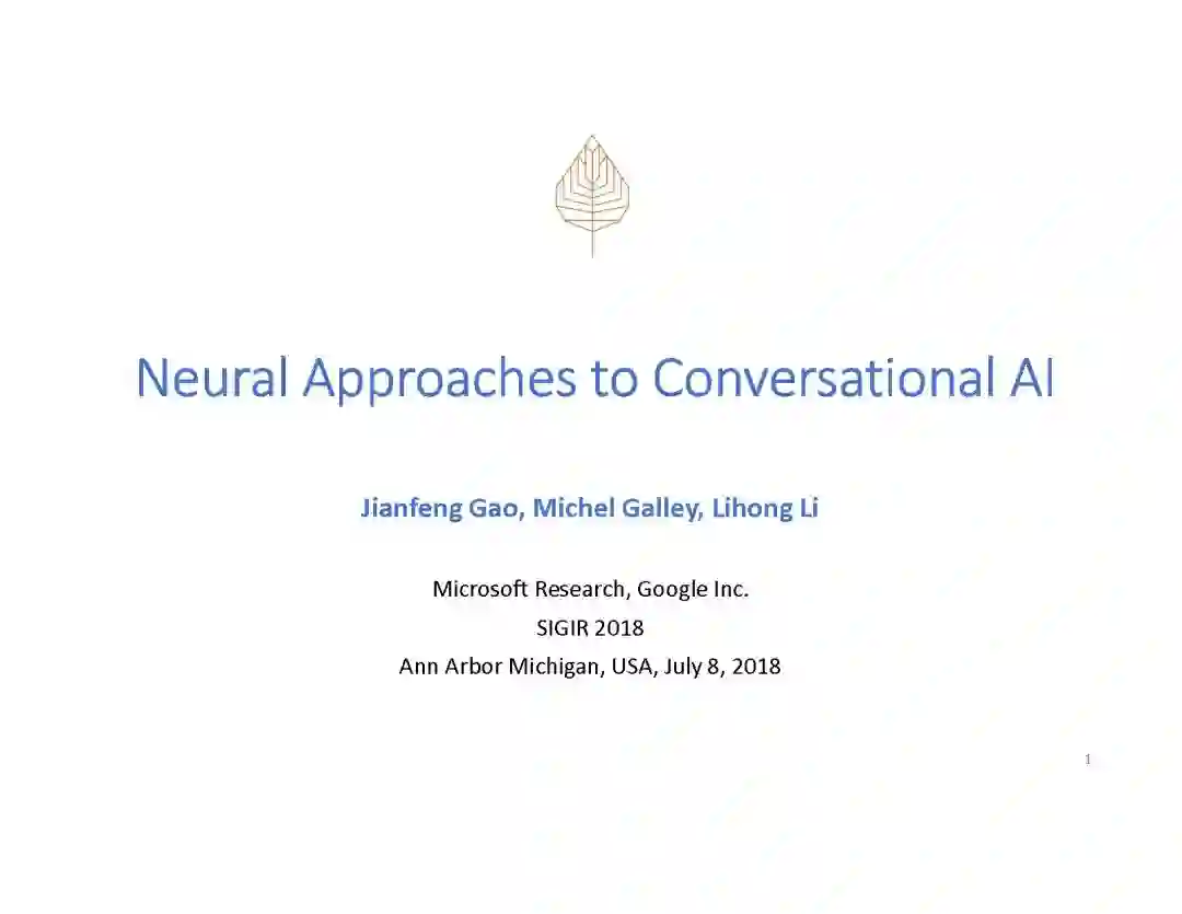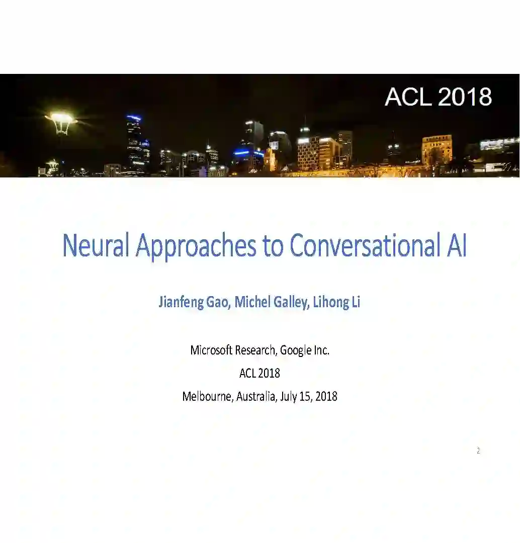 导读:来自微软研究院的高剑锋, Michel Galley ,以及来自 Google的李力鸿, 在今年的7月8日的SIGIR 2018, 以及7月15日的 ACL2018上,做出关于神经网络方法在对话系统中的应用的报告。