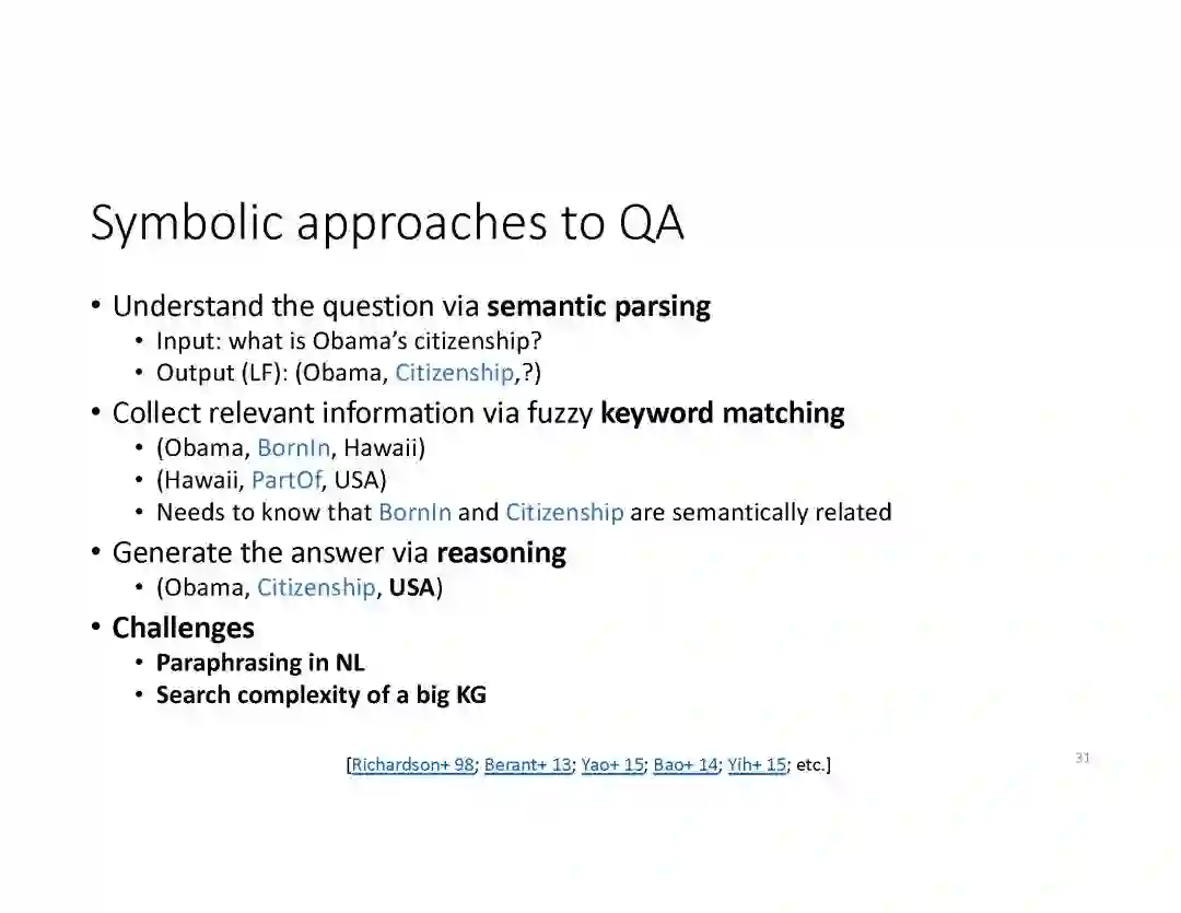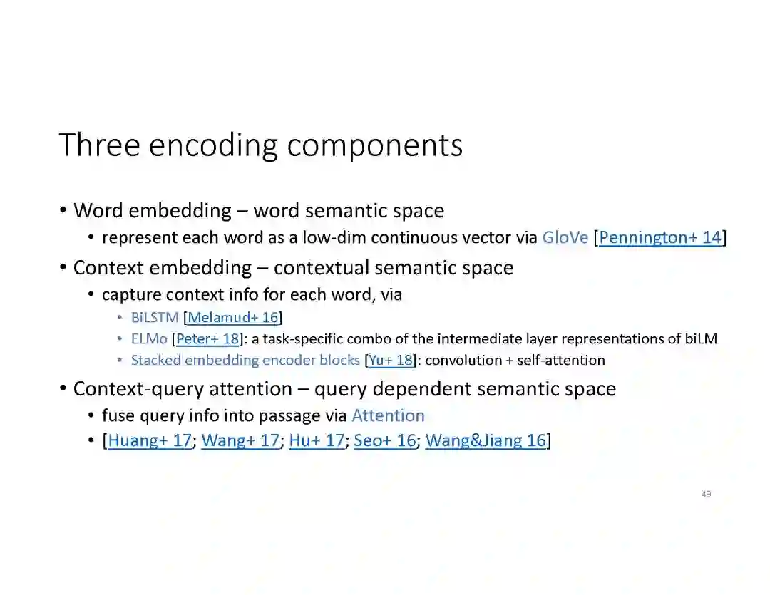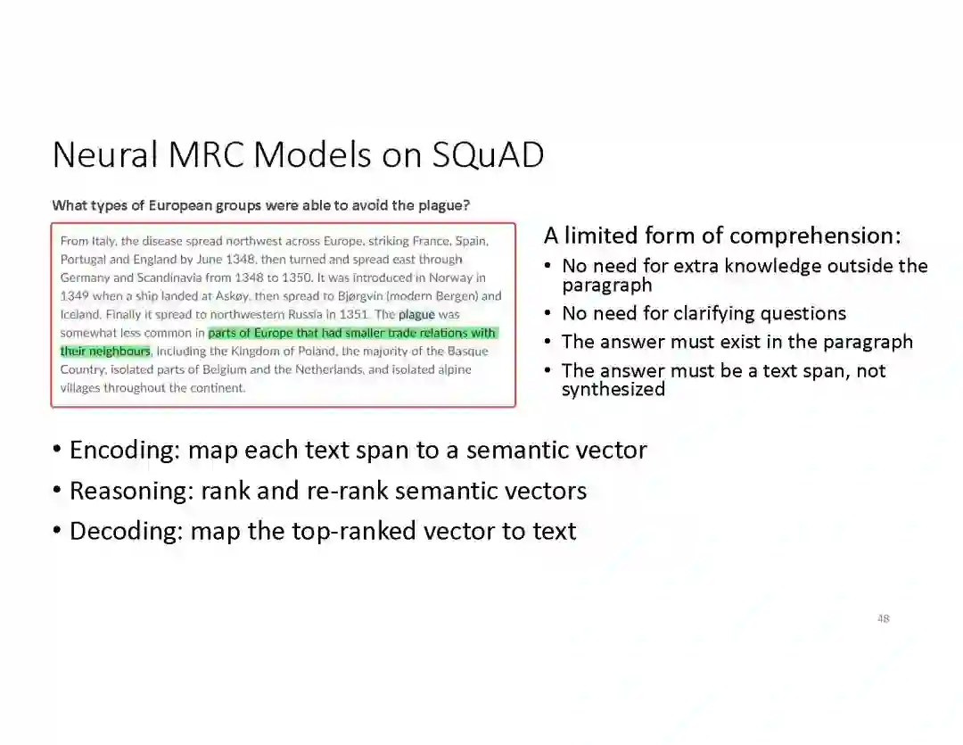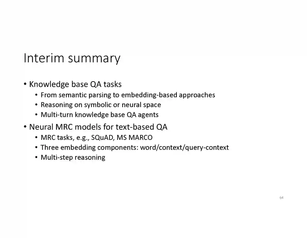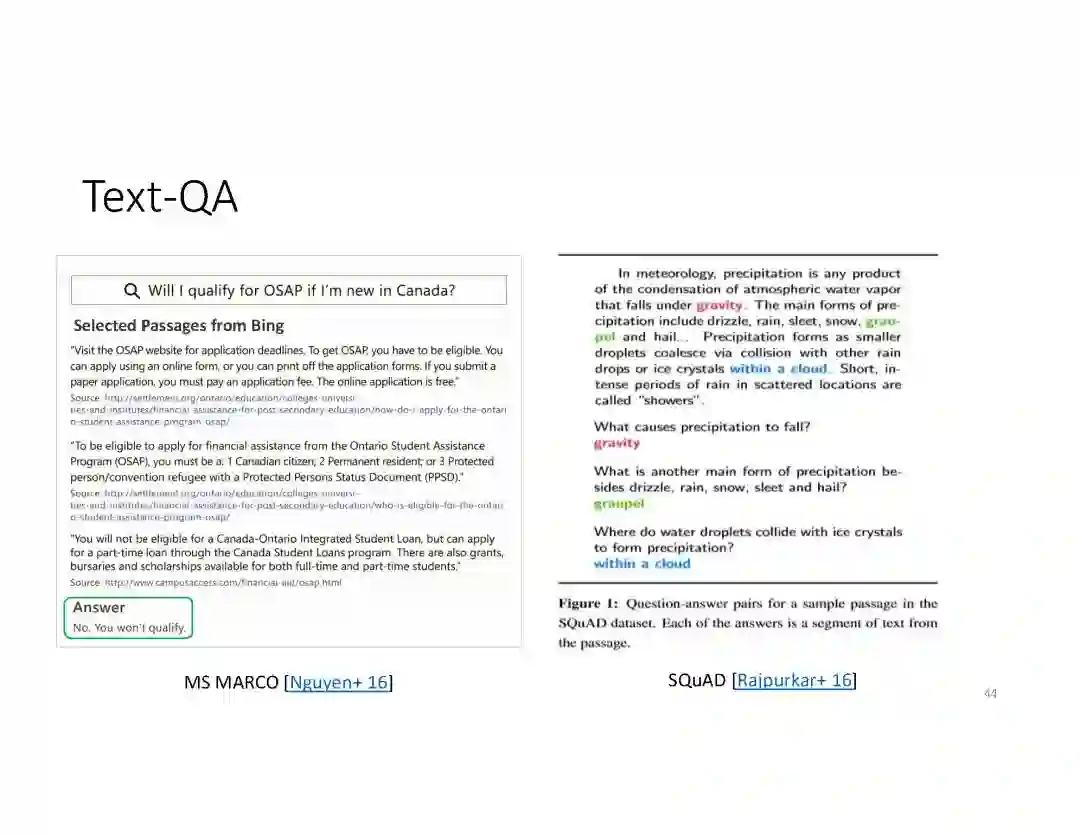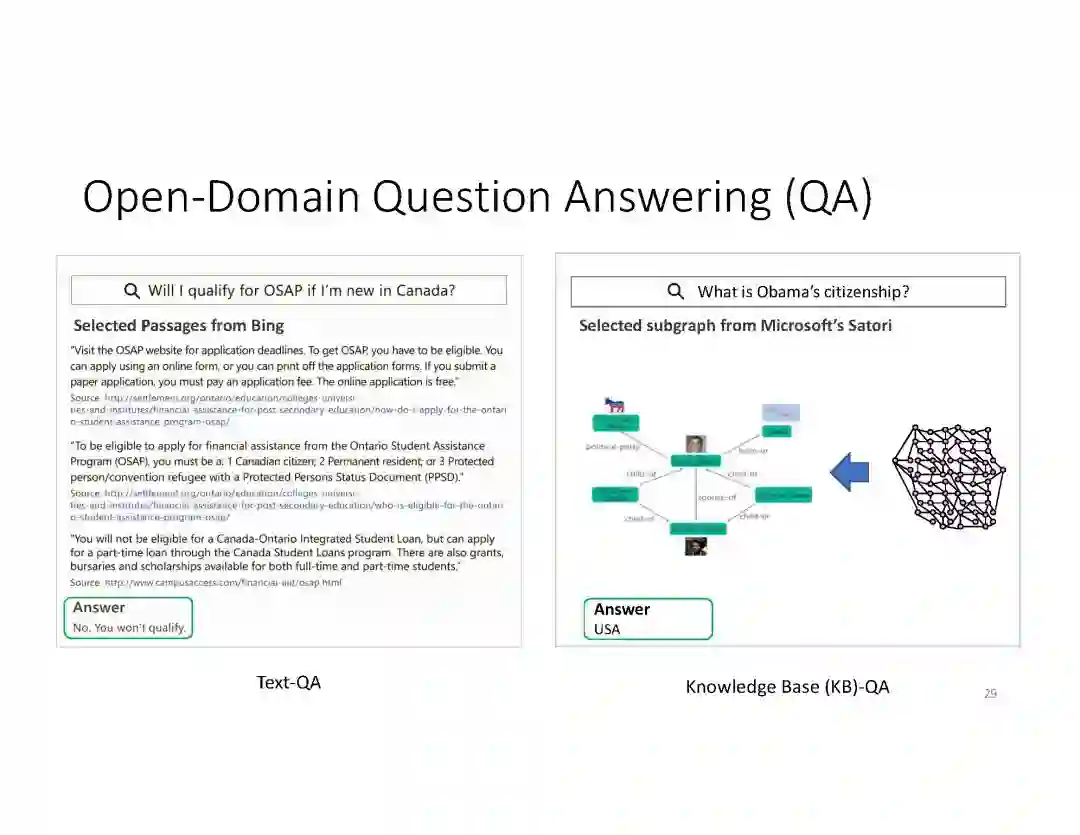 阅读理解问答。阅读理解 QA 能够从Web文档和预编译的知识图谱(KG 's)等各种数据源获取的丰富知识,为用户提出的问题,回复简明直接的答案。