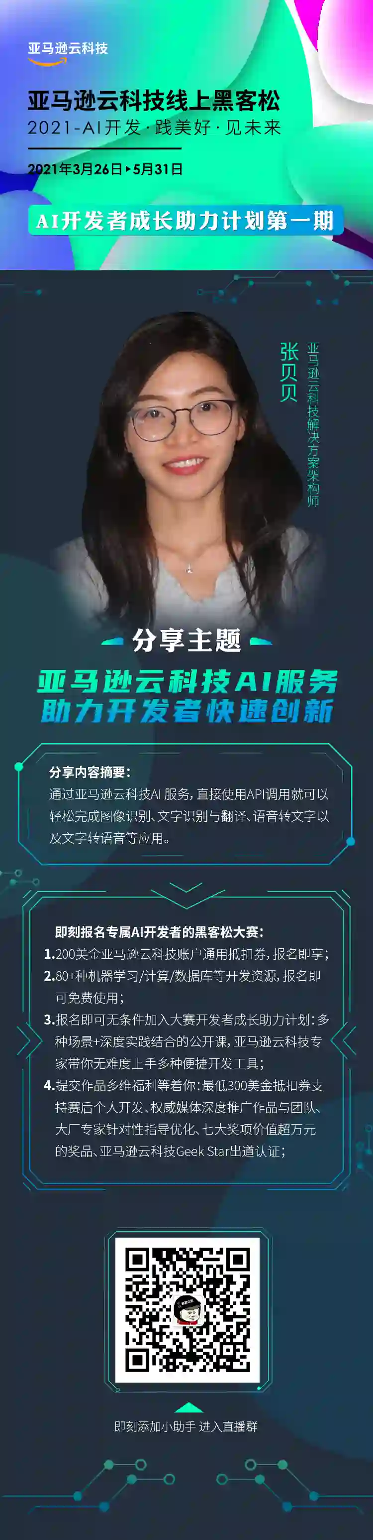 为帮助开发者轻松上手 AI 开发,为开发者提供多种资源助力。4 月 20 日晚 19:00,亚马逊云科技解决方案架构师张贝贝将以「亚马逊云科技 AI 服务助力开发者快速创新」为主题,带来亚马逊云科技 AI 服务实现多种功能的 Live Coding,详细解读亚马逊云科技 AI 服务的使用方式。