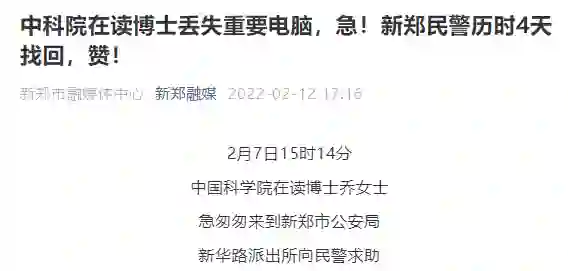 近年来发生不少类似的案例,无数丢失电脑的硕博生们,最终大部分都被寻回,不得不说,能顺利毕业的安全感都是民警给的