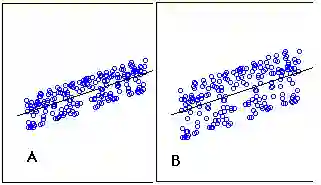 下图展示了两条对随机生成的数据的回归拟合线(A和B),请探究A,B的各自的残差之和:提示:
