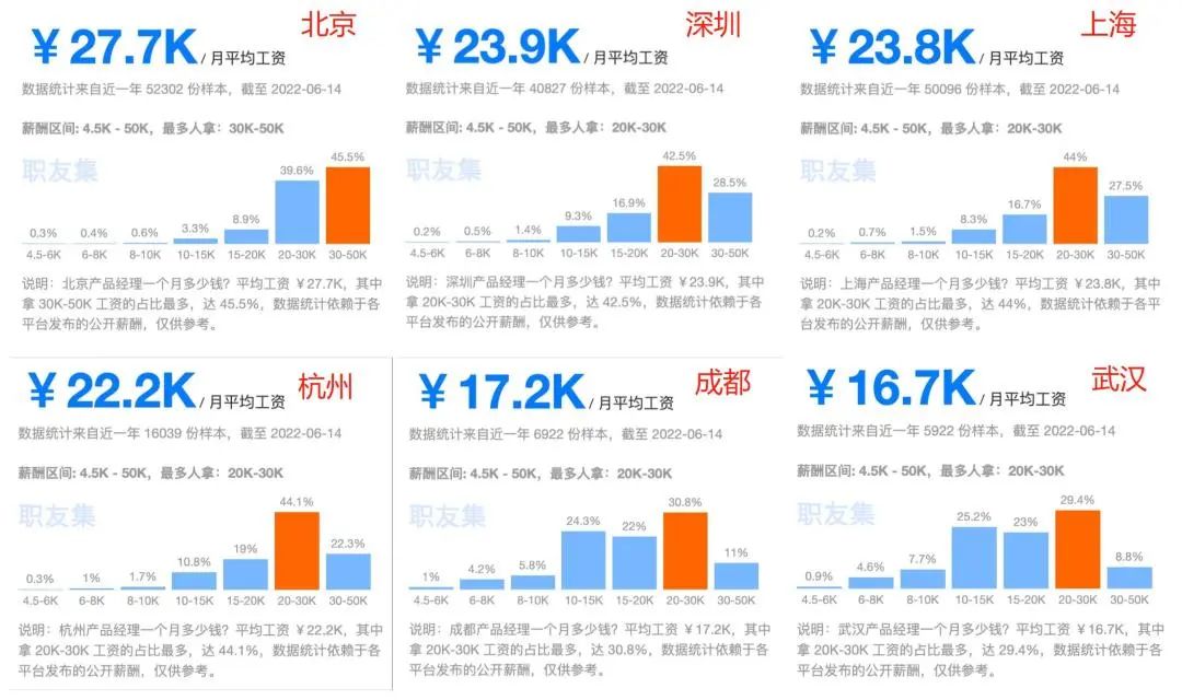 据职友集最新统计,在一线城市北京,产品经理的均薪可以达到27.7k,在新一线城市、二线城市的薪资也很可观,例如在杭州的均薪就达到了22.2k!