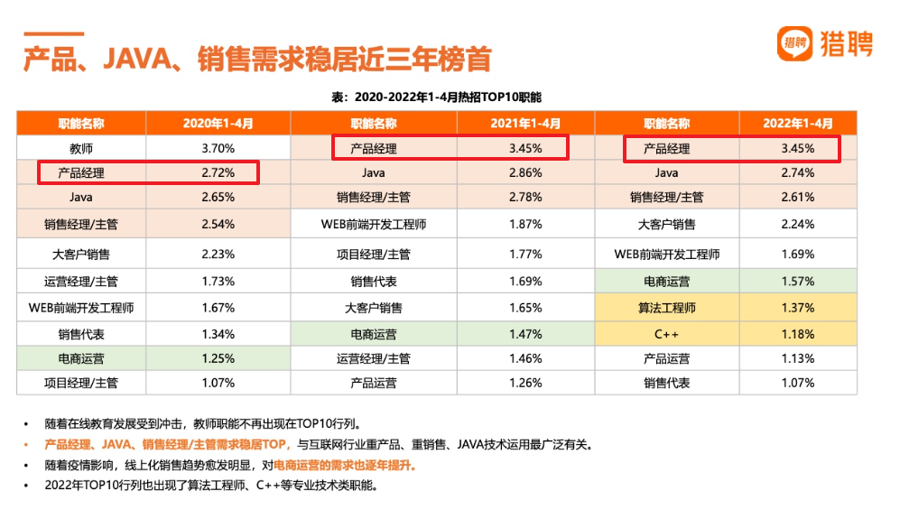 根据猎聘《2022互联网行业中高端人才报告》显示,在2020-2022年Q1热招岗位中,产品经理的招聘需求稳居TOP3!
