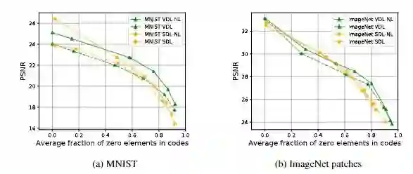 在重构质量上,SDL和VDL模型的编码器的曲线显示了由未激活编码(值为0)成分的平均百分比衡量的稀疏程度和由平均PSNR衡量的重建质量之间的权衡。