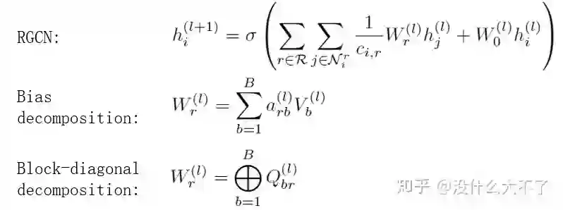 RGCN[14]:对于不同类型的边对应的邻居结点采用不同的参数矩阵从而建模边的异构性。当边的类型很多时,参数也会变得很多,容易造成过拟合,并且不易训练,需要对参数进行规约,使用了一下两种方式: