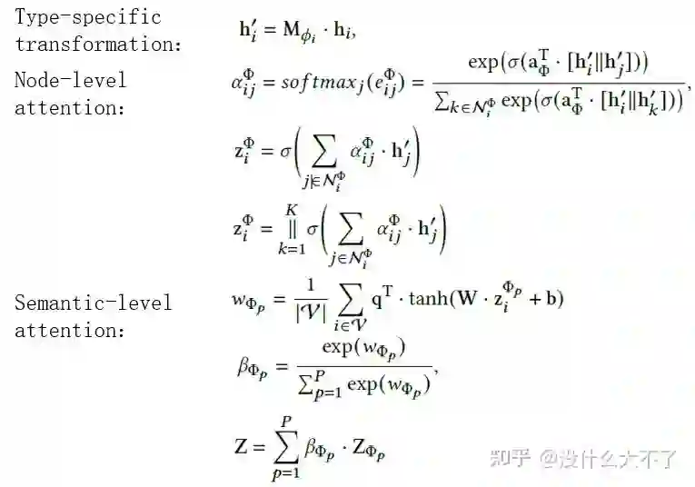 HAN[15]:通过Node-Type-Specific Transformation建模结点的异构性,在计算Attention时不仅考虑了某Meta-Path下邻居的重要性,还考虑了不同Meta-Path之间的重要性。不过HAN比较依赖Meta-Path的人工选择。