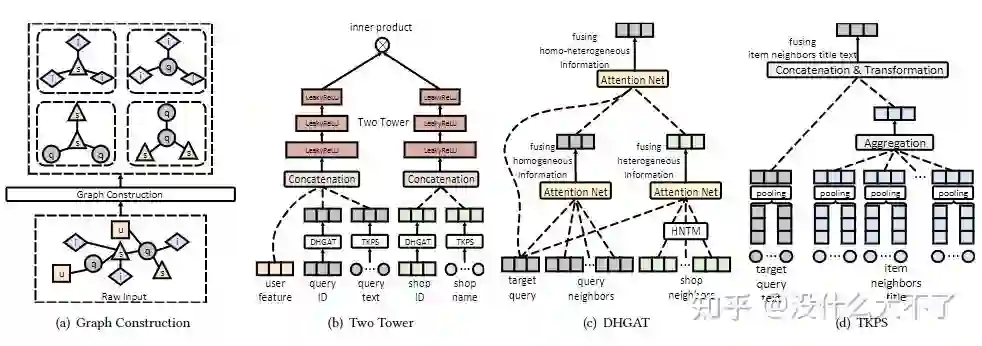 毫无疑问,ID特征是最重要的,但是利用其他特征诸如Item的Shop,Brand,Category等可以增强我们模型的泛化能力。对于这些泛化特征,一方面,我们可以直接使用Feature Concat的方式统一作为结点的特征,另一方面,也可以把这些特征建模为Entity结点从而学习高阶的属性关联信息。利用它们的难点在于特征维度和语义空间的对齐(异构性),可以从图的构建或模型结构方面加以解决。