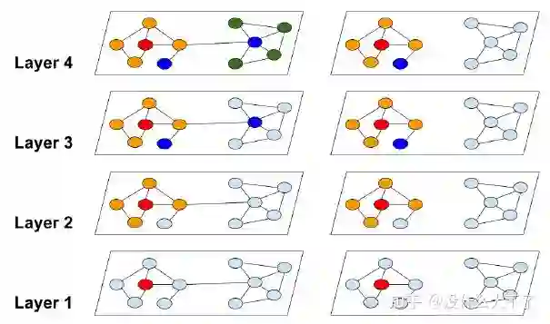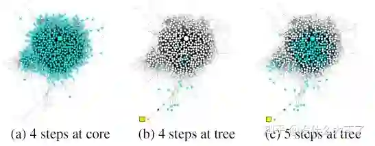 既然2-3层的效果最好,为什么还非要加深呢?这个问题不少工作都不太关心,它们的实验结果也很一般,只是缓解了加深过程的下降,并没有带来什么额外的收益。一种说法是,加深可以增强模型的表达能力(真是个万能理由),就像CNN那样通过加深提升效果。比较靠谱的两种说法是,一是加深可以学习更高阶的邻居信息,这也是不少GNN4Rec工作提到的,高阶信息蕴含了多跳的关联。JKNet中细致分析了中心结点和边缘结点的情况,如下图所示,边缘结点的邻居非常稀疏,需要加深获取更大范围的邻居信息。二是对于半监督结点分类任务来说,通过加深GCN建立长距离的依赖,可以将带标签结点的Label信息传播给更多结点。