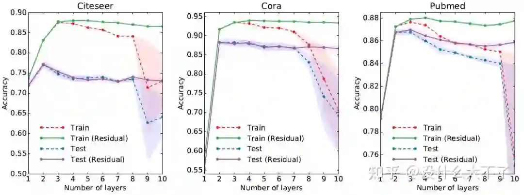 在GCN的实验中发现[11],一般2-3层的GCN可以取得最好的性能,继续增加层数GCN的性能会开始下降,达到8层以上会发生大幅度的下降。