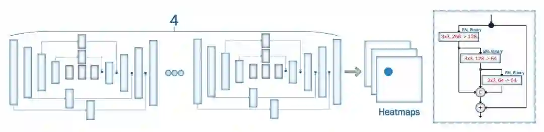 图1. 面部对齐网络由4个HG(Hour-Glass)网络堆叠而成,其中所有的瓶颈块(bottleneck block)均被文献[7]中提出的层级并行多尺度块替代。