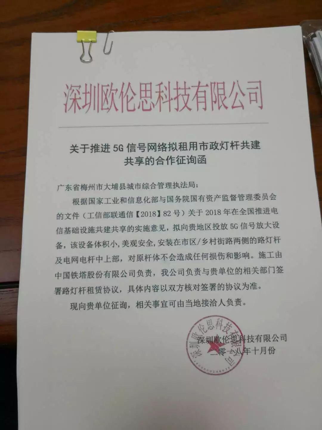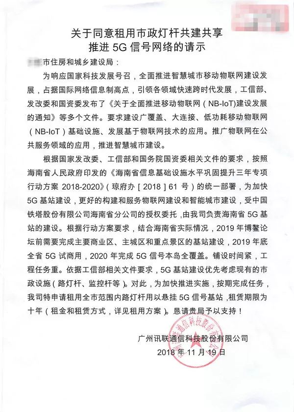 无独有偶,讯联科技也称有个别单位和个人假冒讯联科技公司名义,私刻“广州讯联通信科技股份有限公司”公章,伪造《关于同意租用市政灯杆共建共享推进5G信号网络的请示》文件。