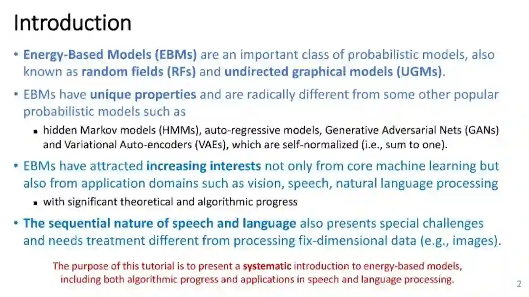 基于能量的模型(EBMs)是一类重要的概率模型,也被称为随机场和无向图模型。ebm与其他流行的概率模型有本质的不同,后者是自规范化的(即和为1),如隐藏马尔可夫模型(HMMs)、自回归模型、生成对抗网(GANs)和变分自编码器(VAEs)。近年来,EBMs不仅吸引了核心机器学习领域的关注,还吸引了语音、视觉、自然语言处理(NLP)等应用领域的关注,在理论和算法上都取得了显著进展。据我们所知,目前还没有关于应用于语音和语言处理的EBMs的教程。语音和语言的顺序性质也提出了特殊的挑战,需要不同于处理固定维数据(如图像)的处理方法。