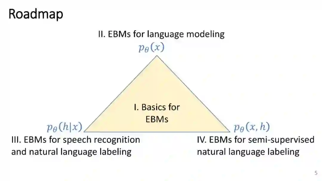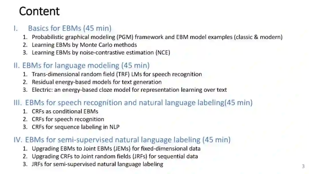 本教程的目的是系统介绍基于能量的模型,包括算法进展和语音和语言处理中的应用,共分为四章。首先,我们将介绍EBMs的基础知识,包括经典模型、最新的神经网络参数化模型,以及从经典方法到最先进的各种学习算法。接下来的三章将分别介绍如何在三种不同的场景中应用EBMs: 1)用于语言建模的EBMs, 2)用于语音识别和自然语言标记的EBMs,以及3)用于半监督自然语言标记的EBMs。此外,我们将介绍开源工具包,以帮助观众熟悉开发和应用基于能源的模型的技术。