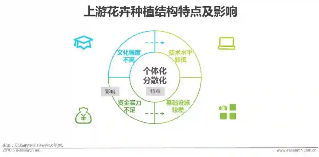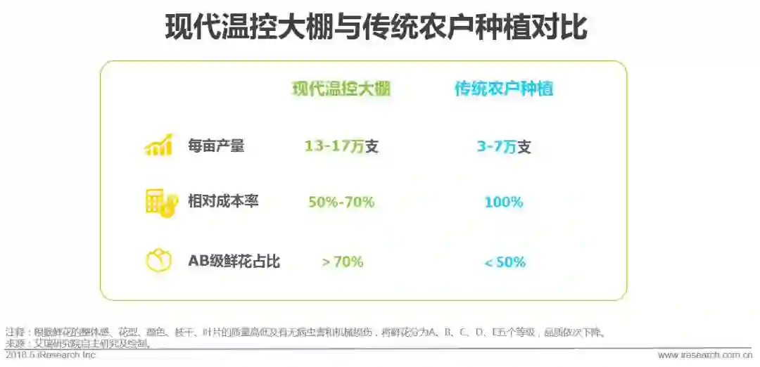 个体化、分散化为主的种植结构产业效率较低,主要体现在品种研发、量产稳定性、品质等维度。传统农户的文化程度普遍不高,对先进种植技术的学习和掌握能力不足,对市场、消费心理认知落后。另外,个体资金实力有限,对于基础设施的投入停留在基本层面,机械化程度低,种植效率低,且过程受天气因素影响大。相比之下,现代温控大棚的产量高出2倍,AB级鲜花比例超过70%,但相对成本率平均节约35%。由此证明上游种植条件的改善对产业发展至关重要,但现阶段发展背景下,种植结构的调整仍需很长一段时间。