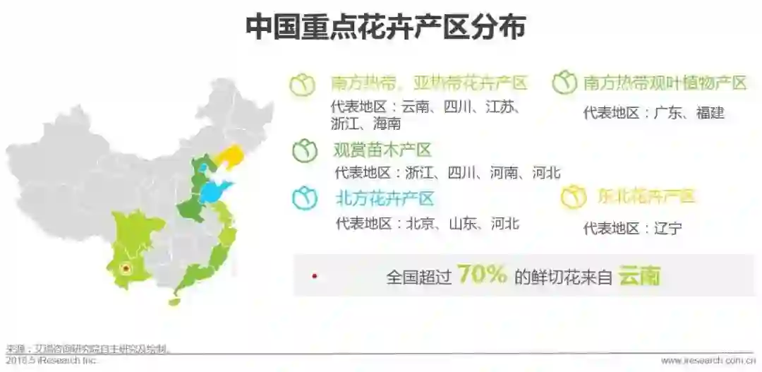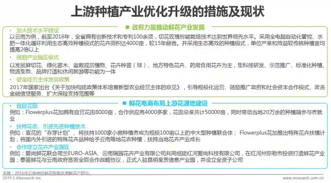 艾瑞分析认为,云南鲜切花产量提升的主要原因在于:1)种植面积的扩张,花卉生产区域由滇中为主向禄劝、江川、通海、玉溪、石林、宜良、弥勒、泸西、陆良等地拓展;2)规模化的企业运作方式,生产管理、种植技术等生产方式得到改善,减少恶劣天气及病虫害影响,且适合优质种苗及新品种的生产,优质花率高,产量稳定。但由于大部分土地仍掌握在个体花农手中,只有积极推动土地流转,再加上资本的投入,才能真正释放生产力。