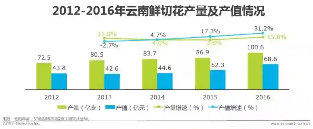 2016年云南鲜切花产量100.6亿支,相较去年同期增长15.8%。2017年云南鲜切花市场总产值超过68亿元,增速高达31.2%,持续三年保持正向高速增长。