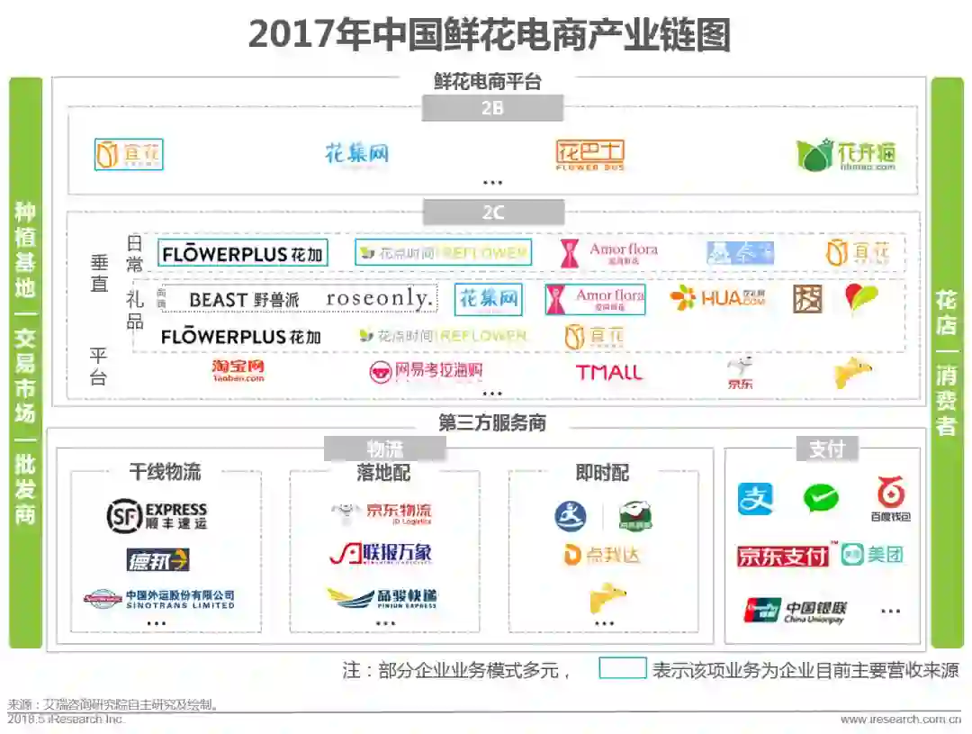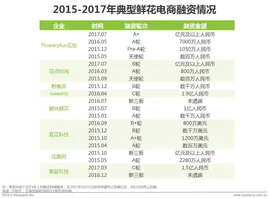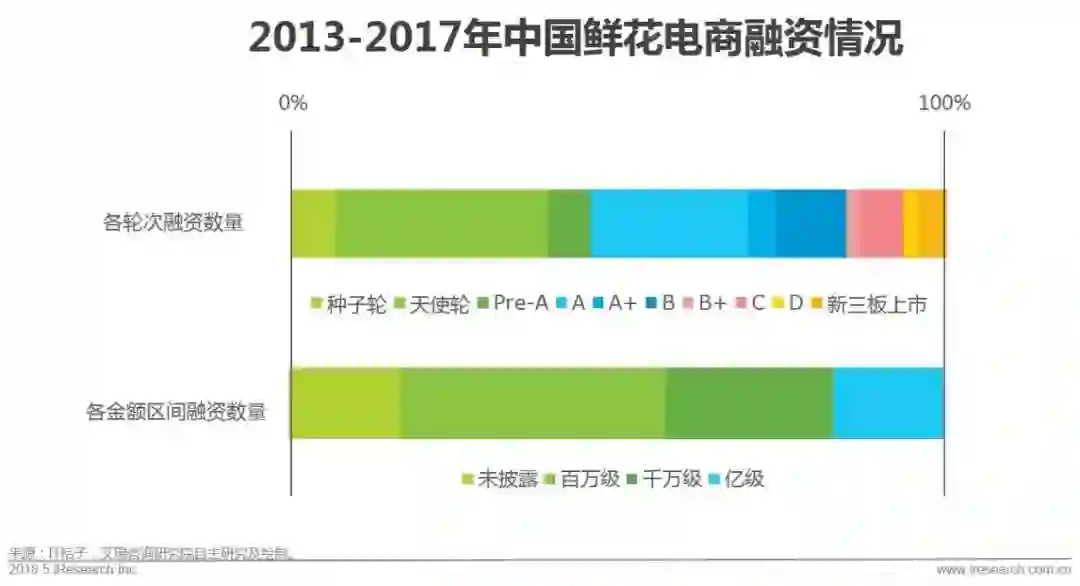 从时间上看,15、16两年是资本市场投资的热潮期,包括上市在内,15年共有17笔融资活动,16年15笔,占到五年间总体融资活动的68%。艾瑞分析认为,一方面是由于消费升级带动的整体投资环境向消费领域的倾斜,另一方面是由于礼品鲜花向日常鲜花转变过程中存在可挖掘的消费红利。