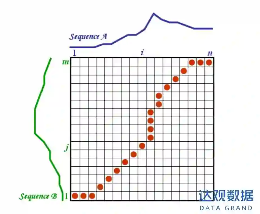 大家看到这个“棋盘”好像和我们上面讲到的编辑距离中的D矩阵很像。没错,假设n为序列A的长度,m为序列B的长度,D(m, n)就是上面这两个序列的规则路径距离。至于D(m, n)怎么求?又到了我们的动态规划发挥威力的时候。还是像求最小编辑距离一样,D(i, j)如下式所求,并且由左到右,由下到上填入D矩阵中,最终求得的右上角的值就是我们的规整路径距离。时间复杂度依然为O(mn)。