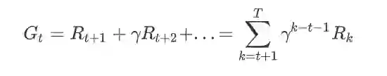 好了,现在有了这些基本要素了,下面要用这些要素做什么呢?比如机器学习里,我们希望是最小化损失函数。而在强化学习里,我们则是希望最大化的累积回报,比如下棋的时候,只要最终赢了即可,而不是要每步都要吃掉对方一些棋子。这时候,我们就先定义一下这个累积回报,假设从