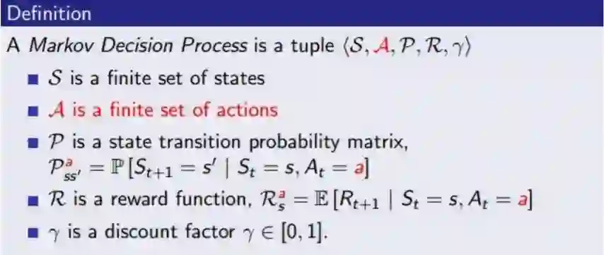 R来表示,不同的回报决定了不同的动作。回报又分为长期的和短期的,就好比做基础算法研究,短期看没什么回报,但长期来说就是技术的护城河。我们通过衰减系数𝛾来表示,0≤𝛾<1。除此以外,我们还要看当前所处的状态S来决定所做的动作。有了状态的集合,那自然要考虑状态之间的转移关系,就是我们的P,状态转移矩阵,但因为对于很多实际问题,状态实在太多,所以每个状态只能考虑前一个状态的相关情况,这样就大大简化了问题的复杂度,这种性质我们也叫马尔科夫性。最后,加上我们的一系列动作A,就有了马尔科夫决策过程(Markov Decision Process, MDP)。