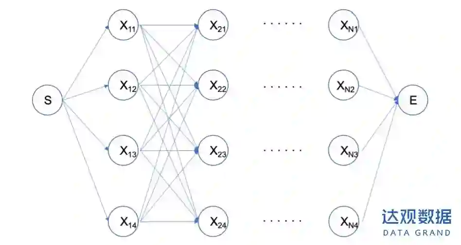 如上图所示,这是一个部分的篱笆网络,中间我们假设有N列,每列有4个节点,节点之间的权重我们暂时忽略。这个时候,网络的最左边有一个节点为S,最右端有一个节点为E。如果我想求S到E之间的最短路径,理所当然,我们如果穷举出所有的路径进行比较,也就是4N条路径,自然可以得到结果,但如果层数很多或者每层的节点数很多的时候,这种方法就显得不够友好了。