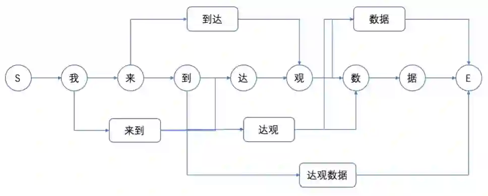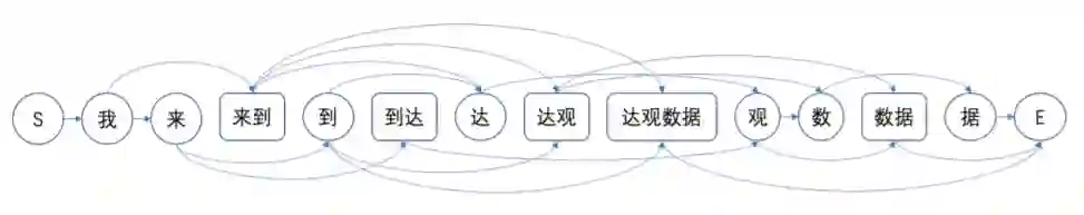 基于词典的分词算法是如何工作的呢?举一个简单的例子,"我来到达观数据"。首先,我们根据词典将句子进行简单的匹配,将句中匹配到的词典词和所有的单字组合起来,作为节点,构造成一个分词的词图,如下图所示(边的权重假设都为1)。那这个图里从