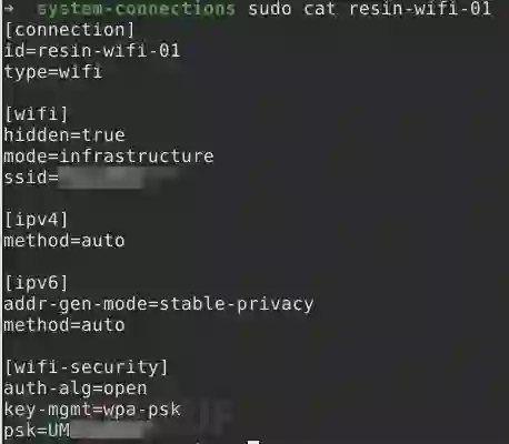 我发现的另一个非常有趣的事情是resin-state路径中第三个分区上的文件/root-overlay/etc/NetworkManager/system-connections/。该文件名为resin-wifi-01。