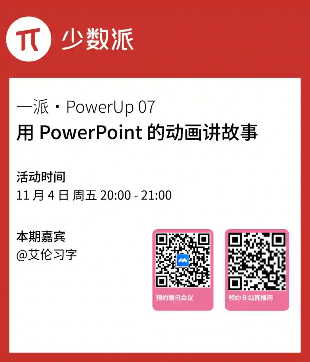 今晚(11.04)八点,我们将在少数派直播间举办「一派·PowerUp」直播活动。我们将与大家一同探讨如何使用 PowerPoint 动画来讲好故事、做好设计。