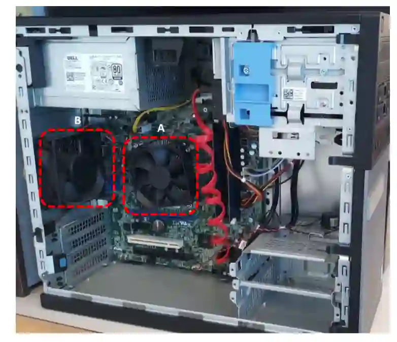 一个典型工作站中的 CPU 风扇(A)和机箱风扇(B)。其中,机箱风扇是本文研究者重点关注的对象。