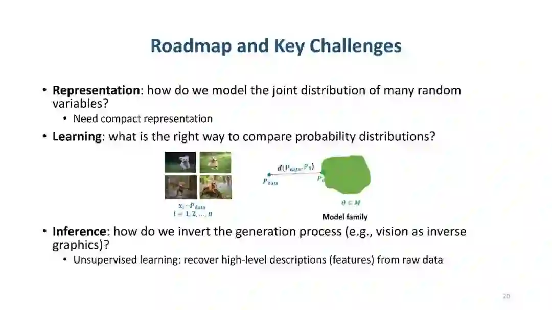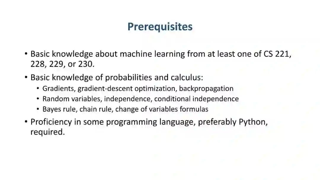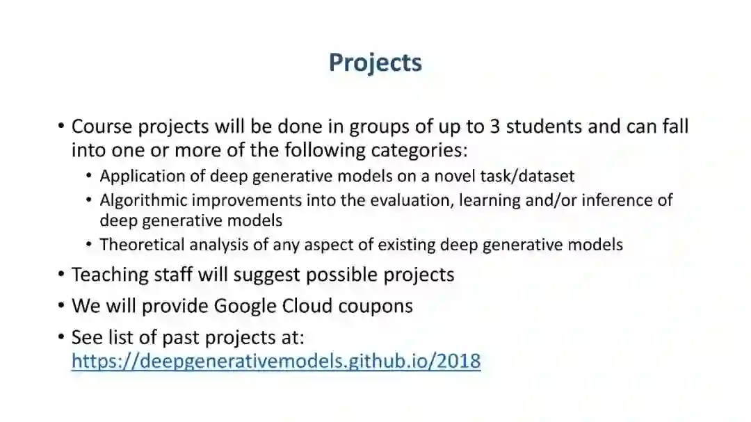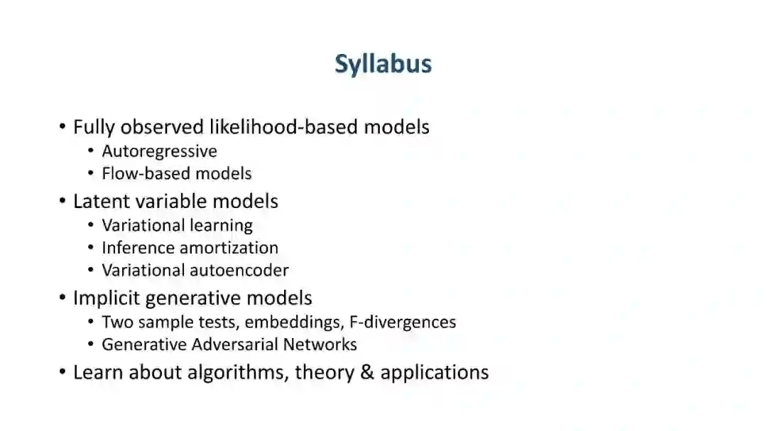 生成式模型被广泛应用到人工智能和机器学习的诸多领域当中。最近,通过结合随机梯度下降的优化方法,使用深度神经网络参数化这些模型所取得的进展,已经使得对于包括图像,文本和语音在内的复杂,高维度数据建模成为可能。在本次课程中,我们将要学习深度生成式模型的概率基础和学习算法,包括自动编码器(AE)的各种变体,生成式对抗网络,自回归模型和标准化流模型(normalizing flow models)。本课程还将讨论从深度生成式模型中获益的应用领域,例如计算机视觉,语音,自然语言处理,图挖掘和强化学习。