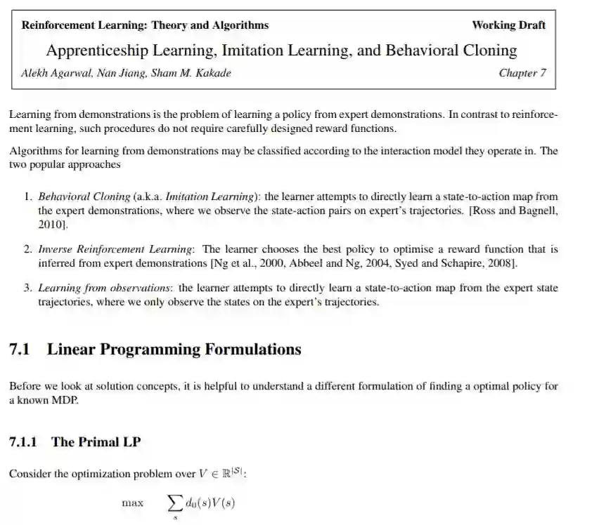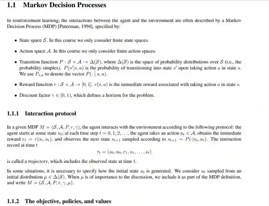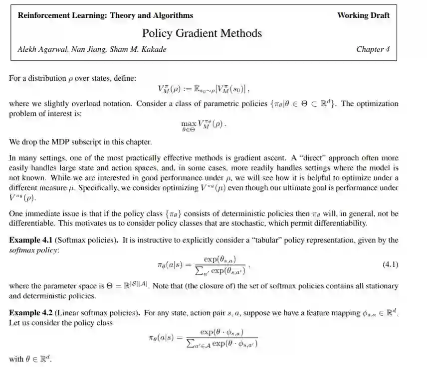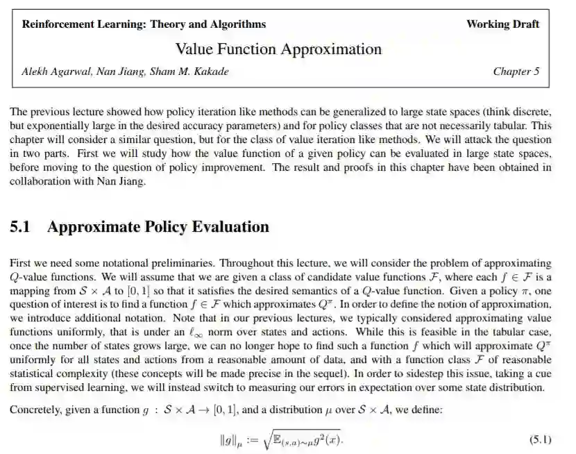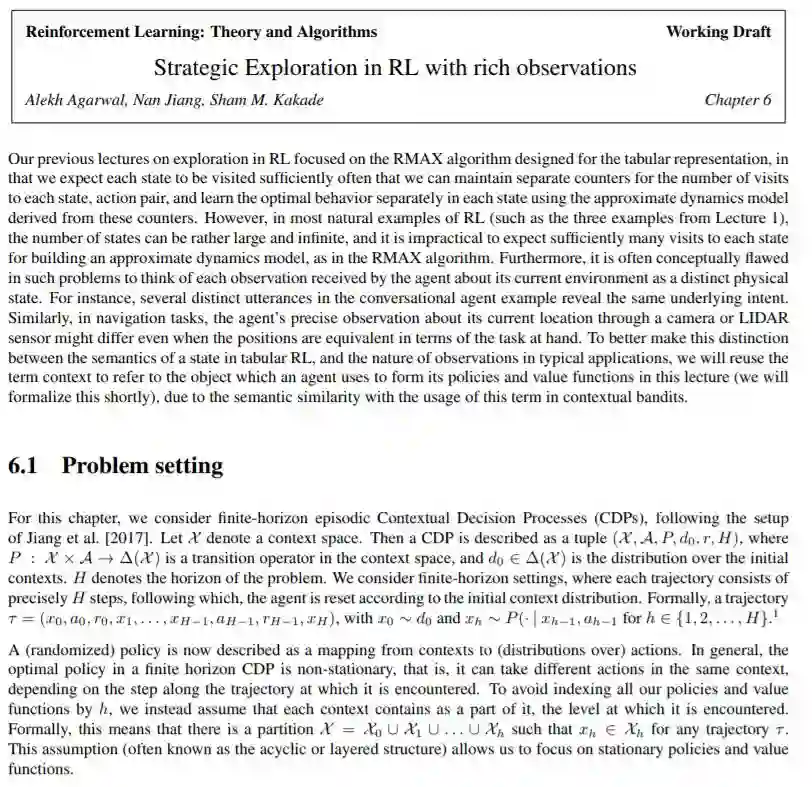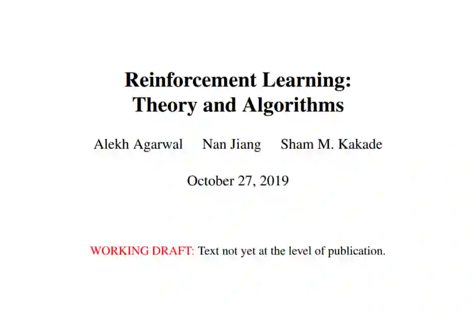 【导读】强化学习是近几年研究的热点,特别是伴随DeepMind AlphaGo的出现名声大噪。微软首席研究经理Alekh Agarwal、UIUC助理教授姜楠、华盛顿研究基金会数据科学主席Sham M. Kakade合编的新书《强化学习:理论与算法》,83页pdf,讲述了强化学习最新进展,包括MDP、样本复杂度、策略探索、PG、值函数等关键议题,是了解强化学习的材料。