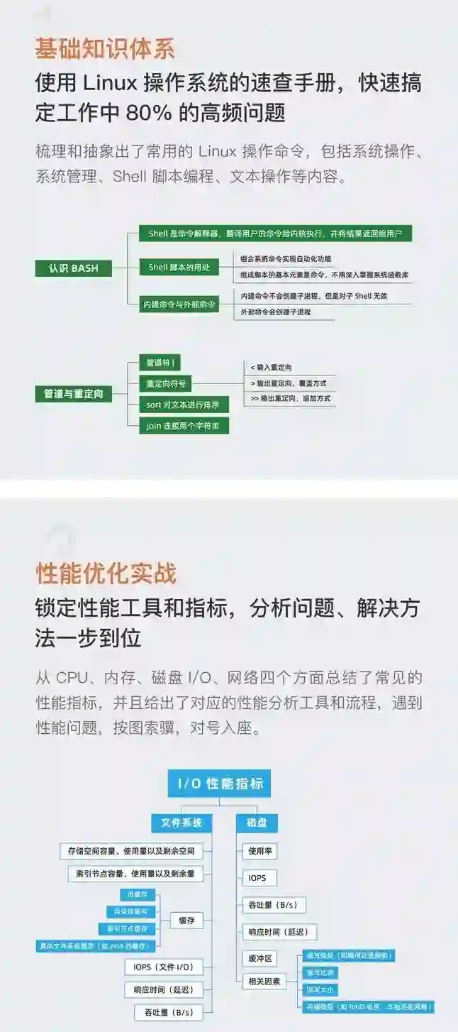 Linux 指令太多太复杂?再也不怕了!这份包含“基础知识体系”“性能优化实战”“操作系统原理” 3 大体系,共 22 个模块的总结性内容,呈现形式为脑图、流程图、表格等。简洁又清晰,想找的知识点一目了然。这可比东一榔头西一棒槌找资料方便多了。