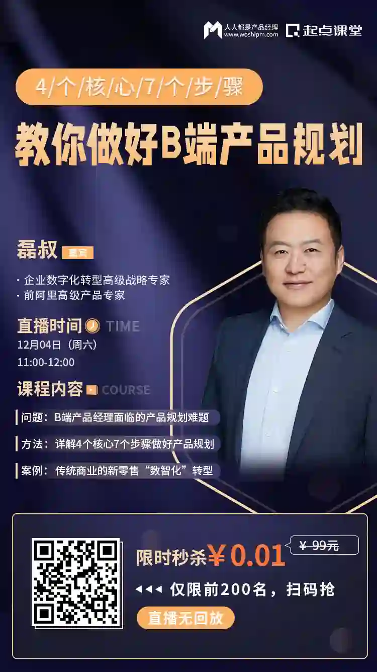 为了帮助B端产品经理解决在B端产品规划方面的问题,人人都是产品经理社区&起点课堂(原起点学院)准备了一场B端产品经理公开课。