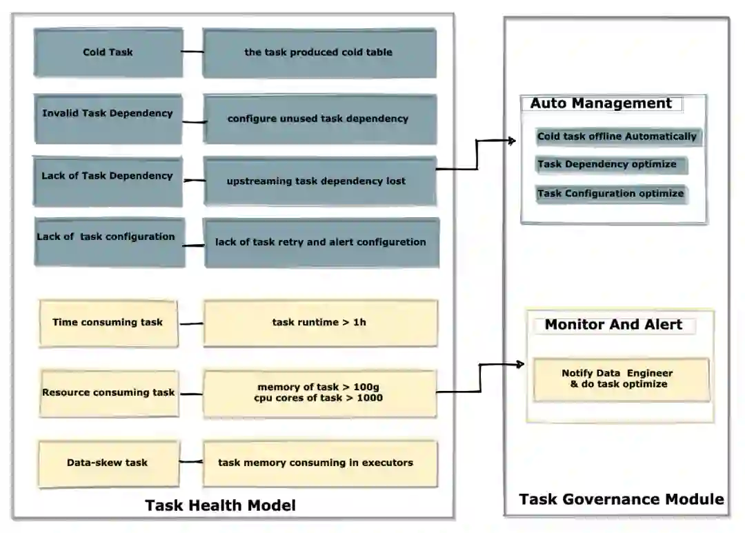 数据生产任务,是数据治理的核心,这些任务如果不持续优化,就会不断出现各类问题。从任务维度,我们根据经验总结主要包括 7 种需要优化的类型,分别是:冷任务,错误的任务依赖,缺少任务依赖,任务配置不合理,耗时过长,耗资源过多,任务倾斜等。Task Health Model 主要是识别以上可以优化的数据计算任务,为任务优化的 action 提供基础。