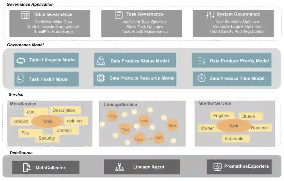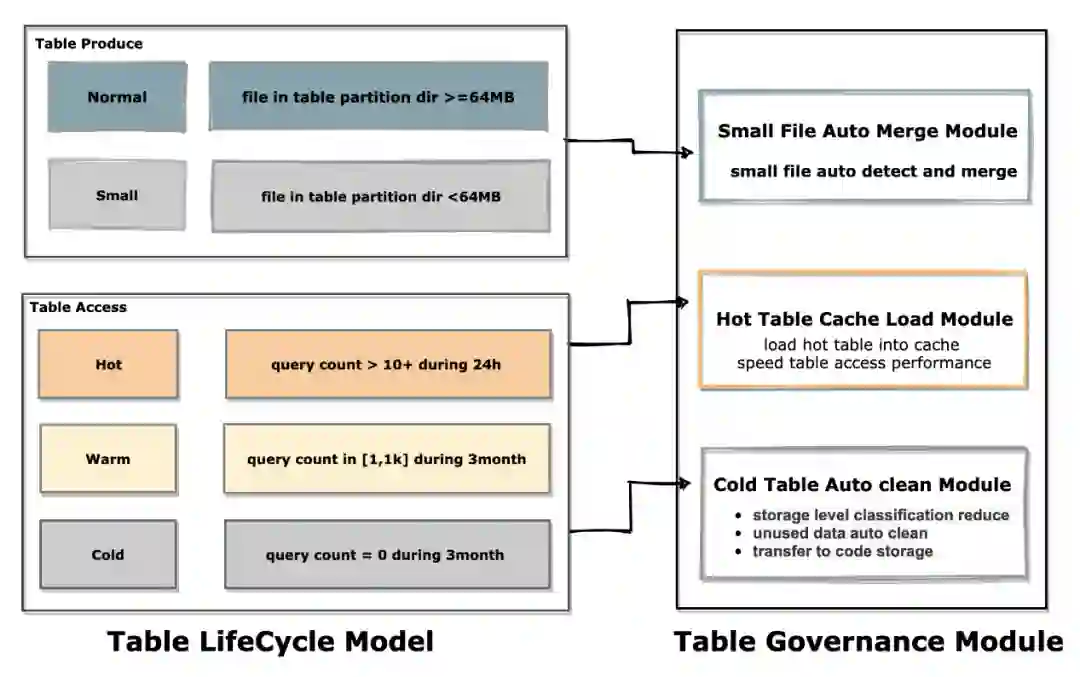 主要用于识别表的访问热度,根据表的访问次数来进行自动化分类:Hot, Warn, Cold,数据治理服务中的 Task Governace Module 即是在 Table Lifecycle Model 的基础上实现模型,策略,执行等全流程自动化治理。