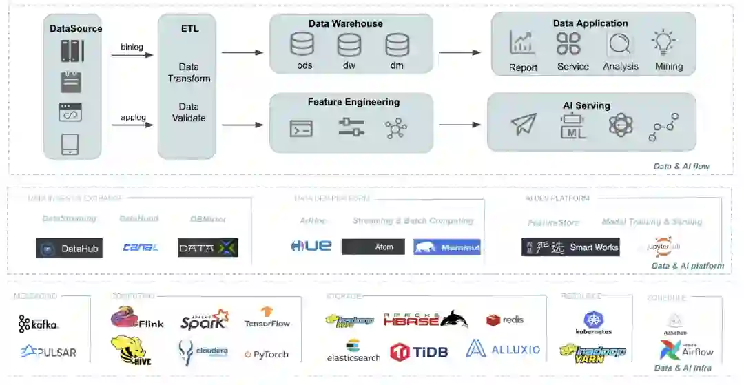 图一是网易严选数据技术体系,我们可以看到,数据从业务系统(业务日志 / 数据库)产生,经过数据的同步和集成,再经过数据开发的加工和整理,最后再被数据产品 / 算法 /BI 等服务和应用使用,整个链路非常长并且会依赖许多消息服务 / 计算 / 存储 / 任务调度 / 资源调度等服务和组件。