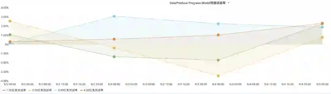 数据系统的状态随时在变化,因此模型的效果也会随之衰退,因此为保证模型的准确率,我们会将每天生产系统的运行数据对我们的沙盘推演模型进行验证和修正。以下是我们的 DataProduce Progress Model 的准确率监控曲线,误差率在 [-4%,4%] 范围波动。