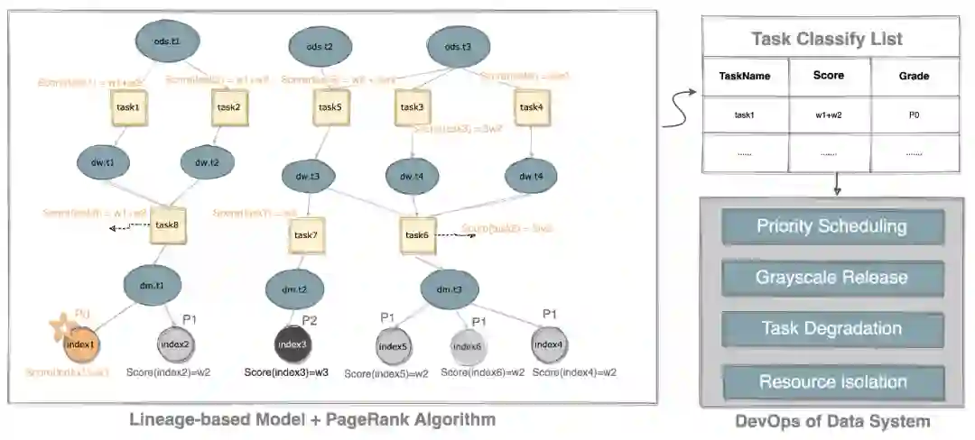 我们采用 PageRank 算法,结合叶子节点标记分数 + 任务本身被依赖次数加权得分,即得出每个任务的分数,然后再根据任务得分,对计算任务进行分级。同时,我们可以把离线批处理链路的优先级加权计算一直追溯到流计算链路,这样从数据的收集 / 传输 / 流处理 / 批处理整个全链路的数据收集和计算任务都可以进行自动分级,设置自动处理策略。
