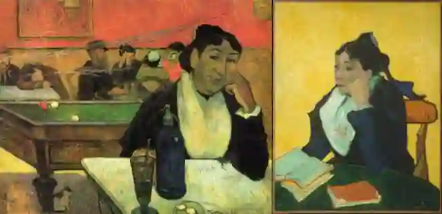 有一回,高更和梵高一起画一位咖啡店的女主人,除了笔触和对色块的运用有共同点外,呈现出来的效果却仍然十分迥异。左:高更《阿尔勒的夜间咖啡店》;右:梵高《Ginoux女士》。图片来源:wikipedia;METs