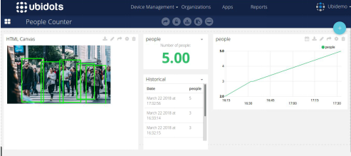def detectPeople(args):image_path = args["image"]camera = True if str(args["camera"]) == 'true' else False# Routine to read local imageif image_path != None and not camera:print("[INFO] Image path provided, attempting to read image")(result, image) = localDetect(image_path)print("[INFO] sending results")# Converts the image to base 64 and adds it to the contextb64 = convert_to_base64(image)context = {"image": b64}# Sends the resultreq = sendToUbidots(TOKEN, DEVICE, VARIABLE,len(result), context=context)if req.status_code >= 400:print("[ERROR] Could not send data to Ubidots")return req# Routine to read images from webcamif camera:print("[INFO] reading camera images")cameraDetect(TOKEN, DEVICE, VARIABLE)