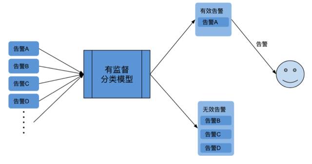 在监督学习中,用于构建分类模型的数据的类标签是已知的。例如,一个垃圾邮件过滤的数据集,它里面将包含垃圾邮件以及非垃圾邮件。在有监督的学习问题中,我们已经知道了训练集中的邮件要么是垃圾邮件,要么是非垃圾邮件。我们将会使用这些信息来训练我们的模型,以对新的邮件进行分类。在运维的场景中,我们可以通过建立有监督的分类模型,来消除告警噪音。