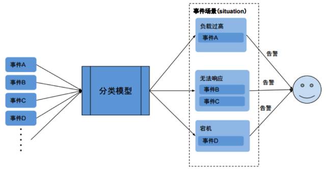 机器学习可以按照预先定义的模型,提取事件的特征,归类到不同的事件场景 (situation) 中,便于运维人员理解与处理。