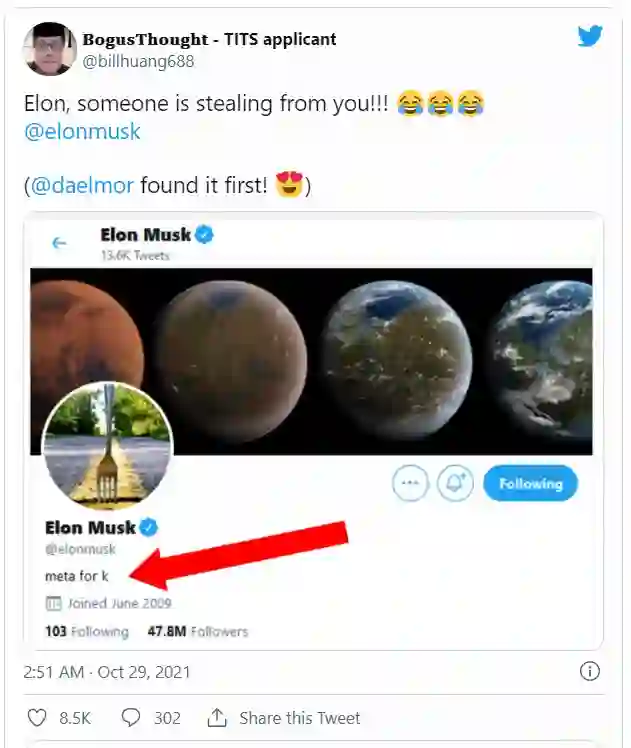 而就在Facebook宣布改名后不久,有Twitter网友发现,实际上马斯克提到Meta这个名字,要远早于Facebook改名。