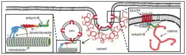有的读者应该猜到了,是通过锚蛋白B呀!网格蛋白抓住细胞膜是通过锚蛋白B,动力蛋白复合体牵住囊泡还是通过锚蛋白B。锚蛋白B缺陷,内吞作用基本瘫痪,让GLUT4“功成身退”的专列开不起来,这些傻傻的看门人只能滞留在细胞膜上,还尽职尽责地噼里啪啦往细胞里放葡萄糖呢