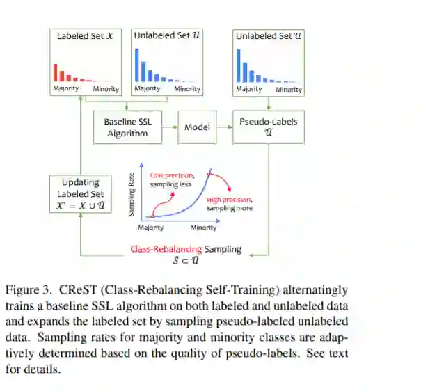 类不平衡数据的半监督学习虽然是一个现实的问题,但已经得到了研究。虽然现有的半监督学习(SSL)方法在少数类上表现不佳,但我们发现它们仍然在少数类上生成高精度的伪标签。通过利用这一特性,在这项工作中,我们提出了类再平衡自我训练(CReST),这是一个简单而有效的框架,用于改进现有的对类不平衡数据的SSL方法。CReST通过从一个未标记集中添加伪标记样本扩展了一个标记集,迭代地重新训练一个基线SSL模型,在该模型中,根据估计的类分布,从少数类中更频繁地选择伪标记样本。我们还提出了一种渐进式分布对齐,以适应调整CReST+的再平衡强度。我们展示了CReST和CReST+在各种类不平衡的数据集上改进了最先进的SSL算法,并始终优于其他流行的再平衡方法。