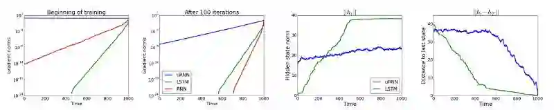 实证表明我们的 uRNN 能够更好地通过长序列传递梯度信息,并且不会遇到像 LSTM 一样多的饱和隐藏状态(saturating hidden states)。