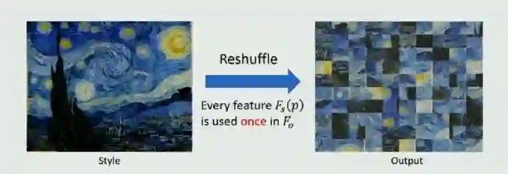 这种方法的核心思想史:将 style image 的 deep feature 做一个重排,也即每个 pixel 出现一次,但是出现的位置已经和原图不一样了。这种重排的结果首先先天地就符合 local 的 style loss;另一面,global loss 当前主要使用的就是对所有 pixel 进行加和的 gram matrix 方法,这种方法并不关心 pixel 是怎样分布的,所以即使打乱了 pixel 的分布,也不会影响 global loss 的结果。因此这种 reshuffle 的方法即符合定义在 gram matrix 上的 global style,同时也符合定义在 patch 上的 local style。在论文中,他们对这个结果做了数学上的分析,这里不再展开。